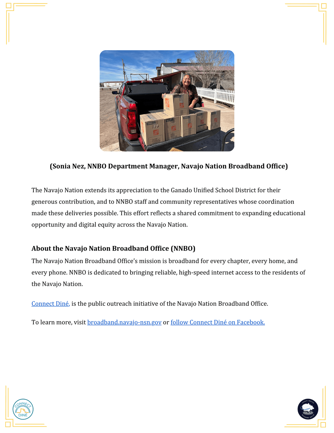 March 19,2026 — The Navajo Nation extends its appreciation to the Ganado Unified School District for their generous contribution, and to NNBO staff and community representatives whose coordination made these deliveries possible. This effort reflects a shared commitment to expanding educational opportunity and digital equity across the Navajo Nation.