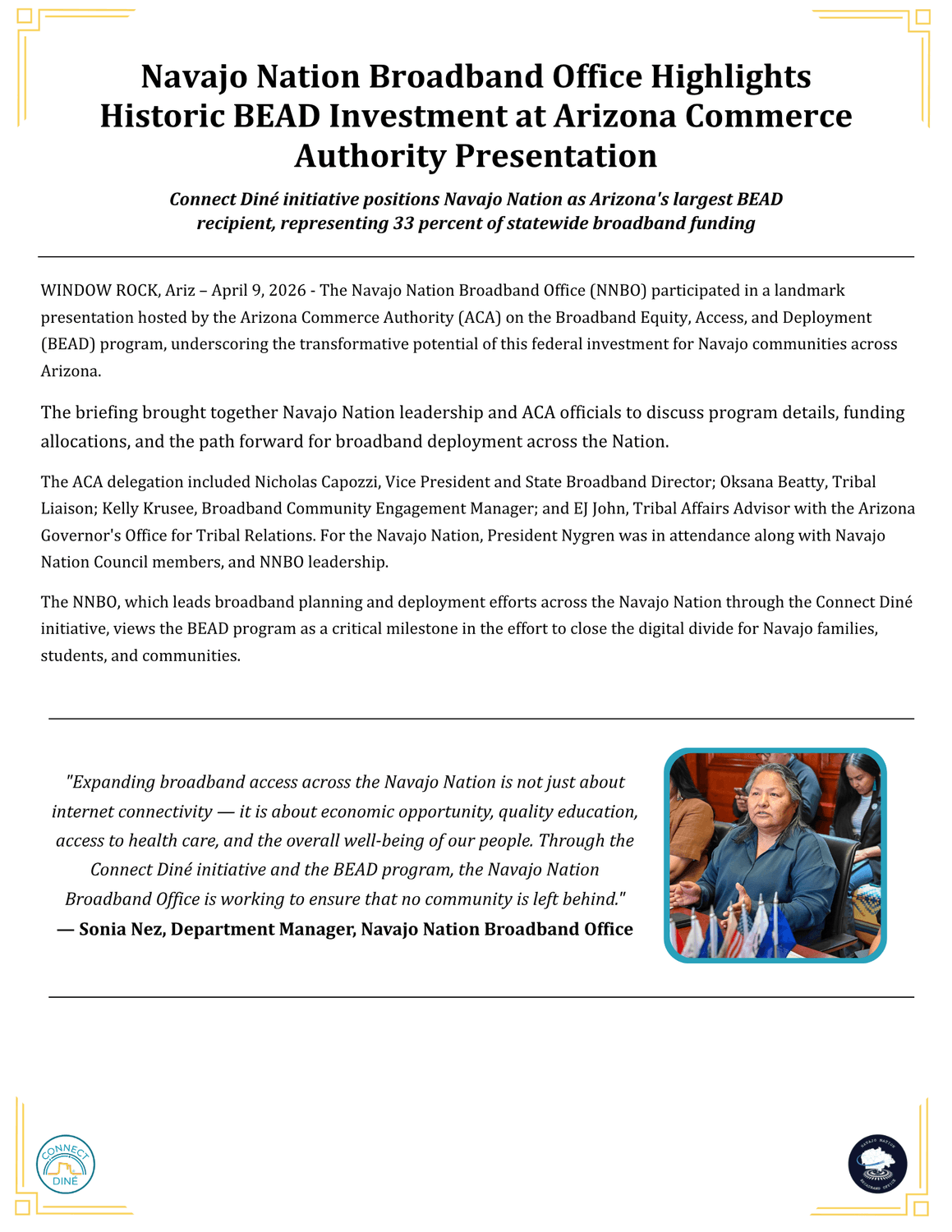 President Buu Nygren recently signed the Navajo Nation Capital Development and Financing Act (CJA-05-26), unlocking $521 million for Navajo Nation broadband infrastructure. Combined with $285 million in federal BEAD funding, this initiative aims to provide high-speed internet access to every Chapter, every home, every phone of the Navajo Nation - fostering new opportunities for health care, education, business, and digital growth.